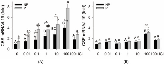 Baseline CBS mRNA was numerically higher in P vs. NP UA, but the difference was not statistically significant. Treatment with E2β significantly stimulated CBS mRNA in a concentration-dependent manner in organ cultures of NP and P rat UA rings in vitro. Treatment with E2β (1 and 10 nM) for 24 h significantly stimulated CBS mRNA expression in both NP and P rat UAs. The stimulatory effects of E2β on CBS mRNA further increased with 100 nM E2β, reaching its maximum level in NP UA by 4.05 ± 0.51-fold vs. control (p < 0.01) and in P UA by 5.35 ± 0.54-fold vs. control (p < 0.01), which were completely abrogated by 1 µM ICI (Figure 1A). In addition, the stimulatory effects of E2β on CBS mRNA in P UA were statistically greater at all tested concentrations (0.01–100 nM) of E2β than in NP UA (p < 0.01). Baseline levels of CSE mRNA did not differ in NP vs. P UA. Treatment with E2β (0.01–10 nM) did not alter CSE mRNA in both NP and P UA, but at 100 nM E2β also increased CSE mRNA expression with similar potency in NP and P rat UA, which was blocked using ICI (Figure 1B).