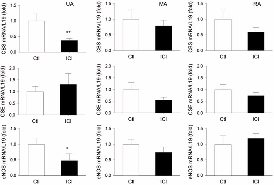 Effects of ICI 182, 760 on uterine and systemic (mesenteric and renal) artery CBS, CSE, and eNOS mRNA expression in pregnant rats in vivo. Time pregnant rats on gestation day 19 were treated with either sesame oil alone (Ctl) or with a specific estrogen receptor (ER) antagonist ICI 182, 780 (ICI, 0.3 mg/rat). Rats (n = 8) were sacrificed at 24 h after injection. Uterine (UA), mesenteric (MA), and renal (RA) arteries were collected to analyze mRNAs of cystathionine β-synthase (CBS), cystathionine γ-lyase (CSE), and endothelial nitric oxide synthase (eNOS) via qPCR with gene-specific primers listed in Table 1; L19 mRNA was measured as an internal control for quantitation. Data (means ± SEM) were summarized from artery samples of 5 different rats/group. * p < 0.05, ** p < 0.01 vs. vehicle (Ctl) treated controls.