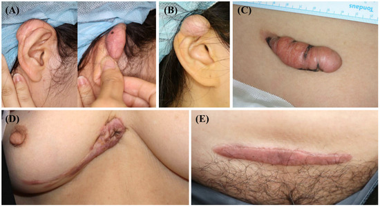 Clinical photographs of the keloid scars included in the present study. (A,B) Keloid scars on the right ear helix that occurred after piercing. (C) A keloid scar on the abdomen that occurred after an orchiopexy surgery. (D) A keloid scar on the anterior chest that occurred after a laceration. (E) A keloid scar on the abdomen that occurred after a total abdominal hysterectomy and bilateral salpingo-oophorectomy.