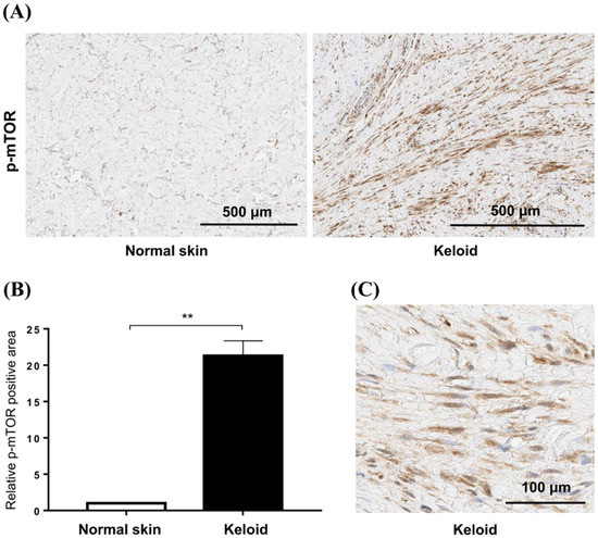 Expression of mTOR in keloid tissues. (A) Phosphorylation of mTOR is increased in active keloid scars compared to normal tissue specimens. The scale bar indicates 500 μm. (B) Semi-quantitative analysis showed that the p-mTOR signaling was increased by 21.3-fold in keloid tissue compared to normal tissue (** p < 0.01). (C) mTOR phosphorylation is increased in the cytoplasm of fibroblasts in keloid tissue.