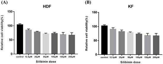 Silibinin (S0417) was purchased from Sigma-Aldrich (St. Louis, MO, USA), dissolved in dimethyl sulfoxide (DMSO) to make 100 mM stock solution, and stored at −20 °C under light-proof conditions until use. In all the experiments described below, the final concentration of DMSO did not exceed 0.1% (v/v), which is not toxic to HDFs and KFs.