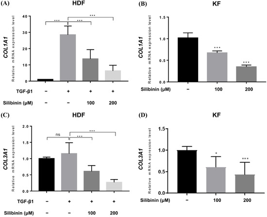 Upregulated collagen expression is frequently observed in keloid scars and is considered a biomarker of keloids. Therefore, qRT-PCR was performed to study the effect of silibinin treatment on collagen type I alpha 1 chain (COL1A1) and collagen type III alpha 1 chain (COL3A1) gene expression in HDFs and KFs. In HDFs, TGF-β1 treatment induced the expression of COL1A1 and COL3A1 genes. TGF-β1-treated HDFs and KFs were treated with 100 or 200 μM of silibinin for 24 h and then examined for COL1A1 and COL3A1 gene expression at the mRNA level. As shown in Figure 5, silibinin significantly downregulated the transcription of both the COL1A1 and COL3A1 genes in a dose-dependent manner.