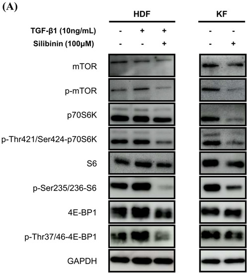 To investigate the effect of silibinin on the mTOR signaling pathway, both KFs and HDFs were treated with 100 μM silibinin for 24 h. The key effectors in the mTOR pathway that are involved in protein synthesis, including p70S6K and 4E-BP1, were assessed by Western blotting. As shown in Figure 6A, TGF-β1 induced the phosphorylation of mTOR, p70S6K, S6, and 4E-BP1 in HDFs. KFs expressed abundant p-mTOR, p70S6K, S6, 4E-BP1, and their phosphorylated forms. The phosphorylated forms of mTOR, p70S6K, S6, and 4E-BP1 were notably reduced by silibinin treatment in TGF-β1-treated HDFs and KFs.