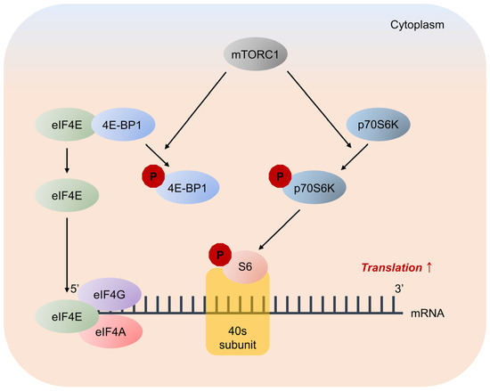 4E-BP inhibits translation by binding and sequestering eukaryotic translation initiation factor-4E (eIF4E) to prevent the assembly of the eIF4F complex. Cytoplasmic eIF4E promotes the initiation of 5′-cap-dependent translation, and nuclear eIF4E stimulates the nuclear-cytoplasmic transport of certain mRNAs [19]. mTORC1 phosphorylates 4E-BP at multiple sites, including threonine residues 37, 46, and 70, and serine residue 65, to trigger its dissociation from eIF4E, allowing mRNA translation [20,21] (Figure 7).