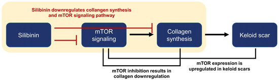 Limitations of this study include its preliminary nature. Despite the decrease in collagen expression and the downregulation of the mTOR signaling pathway, the underlying mechanism of action remains unclear. Further comprehensive investigations are needed to fill these knowledge gaps, and it is essential to conduct in vivo studies to comprehensively evaluate the safety and efficacy of silibinin. Moreover, potential limitations and challenges exist for the clinical use of silibinin. Its chemical structure is highly hydrophobic and non-ionizable, which results in poor water solubility, measuring less than 50 µg/mL [9]. This characteristic significantly impacts the bioavailability of silibinin and poses challenges when developing oral formulations or topical agents. In addition, side effects, including flushing, mild diarrhea, pruritus, and dysgeusia, have been reported in studies that evaluated silibinin as a systemic agent [27]. These side effects must be carefully weighed against the potential therapeutic benefits of silibinin for its clinical use.