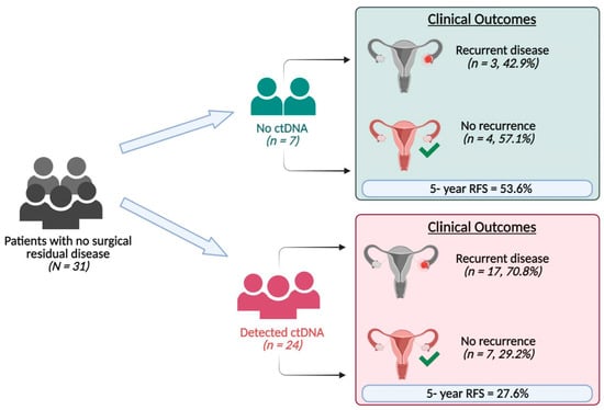 Of the 31 patients with no surgical residual disease, 24 (77.4%) had detectable ctDNA and seven (22.6%) had no detectable ctDNA (Figure 2). Of the 24 patients with detectable ctDNA, 17 (70.8%) had recurrence, and 16 died. Of the seven patients with no detectable ctDNA, three (42.9%) had recurrence, and all three died. Patients classified as having no surgical residual disease who had detectable post-surgery ctDNA had a higher mortality risk compared to those who did not have detectable post-surgery ctDNA (HR = 2.32; 95% CI: 0.67–8.05, p = 0.18), with a five-year survival rate of 85.7% for those with undetectable ctDNA vs. 58.3% for those with detectable ctDNA (Figure S2).