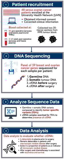 The collection of all biological specimens was carried out in accordance with the UHN Gynecology Biobank Protocol. Tumour tissue specimens were obtained during surgery and stored in formalin-fixed paraffin-embedded (FFPE) blocks until further use for isolation of the somatic tumour DNA. A blood sample was collected before the surgery. Ten millilitres of blood were collected from each patient in purple-top blood tubes. This blood sample was used for extracting DNA from white blood cells as the representative of germline DNA and for extracting cfDNA from plasma used for pre-surgery ctDNA analysis. We also collected a plasma sample 2 weeks after surgery and before starting chemotherapy for extracting cfDNA used for the post-surgery ctDNA analysis. All samples were analysed by sequencing within 5 years of patient diagnosis and blood collection.