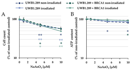 Cytotoxicity of arsenite in UWB1.289 and UWB1.289 + BRCA1 cells. Cell count (A) and ATP content (B) were determined after treatment with NaAsO2. Cells were pre-incubated with NaAsO2 for 18 h, irradiated with 1 Gy, or left unirradiated and post-incubated with NaAsO2 for 8 h. For the non-irradiated cells, this resulted in a total incubation time of 26 h. Shown are mean values ± standard deviations derived from three independent experiments. Statistically significant difference from the control of the respective cell line as determined using ANOVA followed by Dunnett’s T3 post hoc test: * p ≤ 0.05, ** p ≤ 0.01.