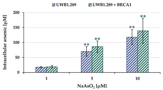 Arsenite treatment resulted in a concentration-dependent and pronounced accumulation of intracellular arsenic in both BRCA1-proficient and BRCA1-deficient cells. In the case of 1 µM extracellular arsenite, 20 µM intracellular arsenic was found, and incubation with 10 µM NaAsO2 resulted in intracellular arsenic levels ranging from 120 µM to 140 µM. No statistically significant differences were found between the two cell lines, suggesting comparable arsenic uptake.