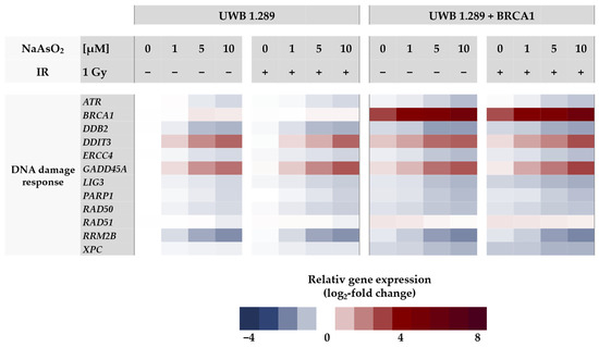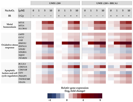Gene expression profiling of UWB1.289 and UWB1.289 + BRCA1 cells after treatment with NaAsO2. Cells were pre-incubated with NaAsO2 for 18 h, irradiated with 1 Gy, or left unirradiated and post-incubated with NaAsO2 for 8 h. For the non-irradiated cells, this resulted in a total incubation time of 26 h. Gene expression was determined using high-throughput RT-qPCR. Genes were classified into the clusters of metal homeostasis, oxidative stress response, apoptotic factors, and cell cycle regulators as well as DNA damage response. The log2-fold changes are derived as mean values from three independent experiments, normalized to the untreated control of the respective cell line, with control equal to 0.