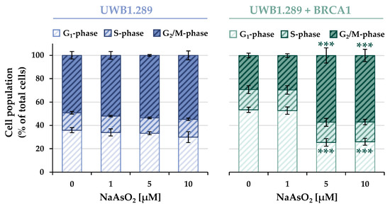 Analysis of the cell cycle distribution of UWB1.289 and UWB1.289 + BRCA1 cells after treatment with NaAsO2 for 26 h. Cell cycle distribution was analyzed by DAPI staining using flow cytometry. Shown are mean values ± standard deviations derived from three independent experiments. Statistically significant difference from control as determined using ANOVA followed by Dunnett’s T post hoc test: *** p ≤ 0.001.