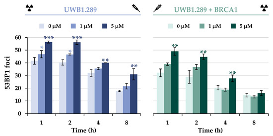 Immunostaining of 53BP1 in UWB1.289 and UWB1.289 + BRCA1 cells after treatment with NaAsO2. Cells were pre-incubated with NaAsO2 for 18 h, irradiated with 1 Gy, and post-incubated with NaAsO2 for 1 h to 8 h. Cells were stained against 53BP1 and manually counted. For each time point and treatment, foci in 40 cells of the G2 phase were counted, and the foci counts of the non-irradiated samples were subtracted from those of the irradiated batch. Shown are mean values ± standard deviations derived from three independent experiments. Statistically significant difference from control as determined using ANOVA followed by Dunnett’s T post hoc test: * p ≤ 0.05, ** p ≤ 0.01; *** p ≤ 0.001.