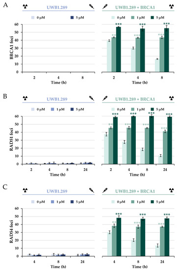Immunostaining of BRCA1, RAD51, and RAD54 in UWB1.289 and UWB1.289 + BRCA1 cells after treatment with NaAsO2. Cells were pre-incubated with NaAsO2 for 18 h, irradiated with 1 Gy, and post-incubated with NaAsO2 for 2 h to 24 h, as indicated in the respective figure. Cells were stained against BRCA1 (A), RAD51 (B), or RAD54 (C), respectively, and manually counted. For each time point and treatment, foci in 40 cells of the G2 phase were counted, and the foci counts of the non-irradiated samples were subtracted from those of the irradiated batch. Shown are mean values ± standard deviations derived from three independent experiments. Statistically significant difference from control as determined using ANOVA followed by Dunnett’s T post hoc test: ** p ≤ 0.01, *** p ≤ 0.001.