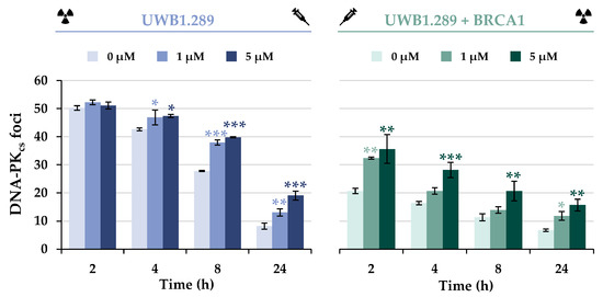 Immunostaining of DNA-PKcs in UWB1.289 and UWB1.289 + BRCA1 cells after treatment with NaAsO2. Cells were pre-incubated with NaAsO2 for 18 h, irradiated with 1 Gy, and post-incubated with NaAsO2 for 2 h to 24 h. Cells were stained against DNA-PKcs and manually counted. For each time point and treatment, foci in 40 cells of the G2 phase were counted, and the foci counts of the non-irradiated samples were subtracted from those of the irradiated batch. Shown are mean values ± standard deviations derived from three independent experiments. Statistically significant difference from control as determined using ANOVA followed by Dunnett’s T post hoc test: * p ≤ 0.05; ** p ≤ 0.01; *** p ≤ 0.001.