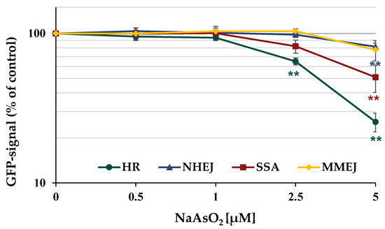 Furthermore, the different repair pathways HR, NHEJ, SSA, and MMEJ were analyzed using a DSB repair reporter assay. U2OS cells carrying specific, inactive GFP expression cassettes, interrupted by an ISce-I restriction site were transfected with ISce-I to induce DNA DSBs. After the successful repair of these DNA DSBs by a specific repair pathway, the expression of active GFP can be quantified using flow cytometry. To obtain maximum GFP signals, cells were incubated for 66 h after transfection. The number of GFP-positive cells was quantified in the absence and presence of arsenite. In general, the results obtained by immunofluorescence were confirmed by the reporter assay shown in Figure 9. The number of GFP-positive cells for error-free HR decreased to about 65% of the control at concentrations as low as 2.5 µM NaAsO2 and to about 25% at 5 µM. While error-prone NHEJ and MMEJ were only slightly affected at the highest concentration, a reduction to approximately 50% of the untreated control was observed for SSA at 5 µM arsenite.