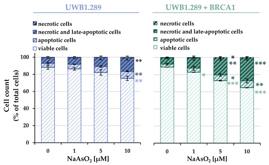 As described above, treatment with NaAsO2 affected the expression of genes associated with apoptosis. To verify the results obtained at the functional level, cell death mechanisms in UWB1.289 and UWB1.289 + BRCA1 cells were subsequently analyzed using flow cytometry. The distribution of viable, necrotic, and apoptotic cells of the non-irradiated samples of both cell lines is shown in Figure 10, while the corresponding results of the irradiated cells are shown in Figure S9.