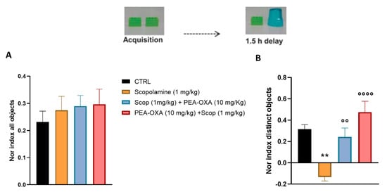 Effects of scopolamine and the preventive or interventistic treatment with PEA-OXA in scopolamine-injected mice on cognitive performance (learning and recognition memory). (A,B) show the NOR index and images of different objects in the object recognition protocol during acquisition and a 1.5 h delay in the CTRL, scopolamine (1 mg/kg), PEA-OXA (10 mg/kg) + scopolamine (1 mg/kg), and scopolamine (1 mg/kg) + PEA-OXA (10 mg/kg) mice. Data are represented as the mean ± SEM of six mice per group. p < 0.05 was considered statistically significant. ** p < 0.01 vs. CTRL, °° p < 0.01, and °°°° p < 0.0001 vs. scopolamine (1 mg/kg). An ANOVA test was assessed and the Tukey test was used for multiple comparisons.