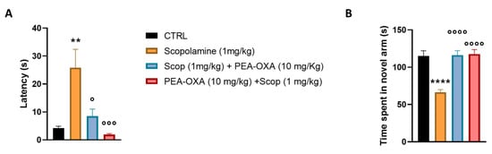 Effects of scopolamine and the preventive or interventistic treatment with PEA-OXA in scopolamine-injected mice on cognitive performance (spatial working and reference memory). (A,B) show the latency and time spent in the novel arm in the Y-maze forced alternation test in the CTRL, scopolamine (1 mg/kg), PEA-OXA (10 mg/kg) + scopolamine (1 mg/kg), and scopolamine (1 mg/kg) + PEA-OXA (10 mg/kg) mice. Data are represented as the mean ± SEM of six mice per group. p < 0.05 was considered statistically significant. ** p < 0.01 and **** p < 0.0001 vs. CTRL, ° p < 0.05, °°° p < 0.001, and °°°° p < 0.0001 vs. scopolamine (1 mg/kg). An ANOVA was assessed and the Tukey test was used for multiple comparisons.