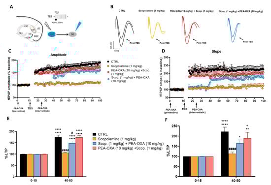 Long-term potentiation (LTP) in the LEC-DG-pathway in the CTRL, in mice treated with scopolamine alone 15 min pre-TBS, in mice that underwent intranasal PEA-OXA treatment 15 min before scopolamine, or 15 min post-TBS. (A) Graphical representation of the recording electrode and stimulating electrode in the dentate gyrus and the lateral entorhinal cortex, respectively. (B) Representative traces recorded in the CTRL, scopolamine, PEA-OXA (10 mg/kg) + scopolamine (1 mg/kg), and scopolamine (1 mg/kg) + PEA-OXA (10 mg/kg) groups before and after TBS. (C,D) Plot of the fEPSP amplitude and slope recorded before and after the induction of LTP in the DG of the CTRL, scopolamine, PEA-OXA (10 mg/kg) + scopolamine (1 mg/kg), and scopolamine (1 mg/kg) + PEA-OXA (10 mg/kg) groups. The extent of LTP was calculated as a percentage of the baseline between 40 and 80 min of recording. (E,F) Bar graphs of LTP in the CTRL, scopolamine, PEA-OXA (10 mg/kg) + scopolamine (1 mg/kg), and scopolamine (1 mg/kg) + PEA-OXA (10 mg/kg) groups, n = 6. Two-way ANOVA followed by Tukey’s for multiple comparisons test was performed. p < 0.05 was considered statistically significant. * p < 0.05, ** p < 0.01, and **** p < 0.0001 vs. 0–15, ◦ p < 0.05 and °°°° p < 0.0001 vs. 40–80 Scopolamine (1 mg/kg), # p < 0.05 and #### p < 0.0001 vs. 40–80 CTRL.