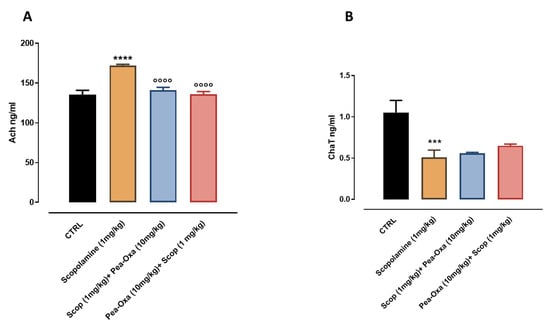 The levels of Ach and ChAT in the serum were measured by an ELISA assay. Scopolamine-treated animals (1 mg/Kg i.p.) showed an increase in the expression levels of Ach (172.0 ± 1.52, p < 0.0001), compared to the levels of Ach in the control mice (135.2 ± 5.61) (one-way ANOVA followed by Dunnett post hoc test). The acute treatment with PEA-OXA (10 mg/kg i.n.) before and after scopolamine 1 mg/kg i.p, decreased the expression levels of Ach, in both conditions (scopolamine + PEA-OXA141 ± 3.59 p < 0.0001; PEA-OXA + scopolamine 135.8± 3.50 p < 0.0001) (one-way ANOVA followed by Dunnett pos hoc test). Scopolamine-treated animals (1 mg/Kg i.p.) showed a decrease in the expression levels of ChaT (0.51 ± 0.087, p = 0.0007), compared to the levels of ChaT in the control mice (1.05 ± 0.14) (one-way ANOVA followed by Dunnett post hoc test). The acute treatment with PEA-OXA (10 mg/kg i.n.) before and after scopolamine 1 mg/kg i.p. showed a slight increase in the expression levels of Ach, in both conditions (scopolamine + PEA-OXA0.56 ± 3.59); PEA-OXA + scopolamine 0.65 ± 0.020) (one-way ANOVA followed by Dunnett post hoc test) (Figure 4).