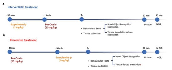 Mice were randomized into four experimental groups for the preventive and therapeutic acute treatment (CTRL, scopolamine (1 mg/kg), PEA-OXA (10 mg/kg) + scopolamine (1 mg/kg), and scopolamine (1 mg/kg) + PEA-OXA (10 mg/kg)). Each group was identified by an alphanumeric code and all experiments were carried out by blind operators. Experimental evaluations were carried out based on preventive (Figure 1A) and therapeutic-based (Figure 1B) protocols. In particular, intra-nasal PEA-OXA was delivered 15 min before or after systemic scopolamine, and behavioral tests were performed 30 min (Y-maze) and 90 min (NOR) after the last injection. Tissue for molecular biology was collected at the end of behavioral evaluations. Regarding the electrophysiological experiment, it was performed on a different set of mice, and scopolamine was administered 15 min before electrical tetanization. Instead, intra-nasal PEA-OXA was injected 15 min before scopolamine in the i therapeutic protocol or 15 min after TBS in the therapeutic protocol.