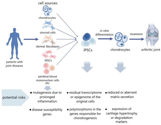 According to the data on epigenetic memory, it can also be assumed that pathological cell iPSCs can inherit epigenetic patterns characteristic of a particular disease. Annual OA reviews shed light on more and more epigenetic markers that are identified as those of multifactorial polygenic OA, plenty of which may also serve as therapeutic targets. Among them are characteristic miRNAs, circular RNAs, and long non-coding DNAs, as well as patterns of methylation and hydroxymethylation. Since most of the genetic variations associated with OA are in non-coding regions of the genome, gene regulation plays a large role in the development of pathology, which means that epigenetics will be the focus for researchers [,]. However, there are practically no studies devoted to the search for these epigenetic markers in iPSC cultures obtained from articular cartilage disease patients. In work on the development of a new line of iPSCs from OA donor MSCs, Pichard et al., note that iPSCs can become an important tool in the study of the genetic and epigenetic factors of OA []. Finally, in a recent study, Khan et al., demonstrated the dissimilar differentiation potential of iPSCs derived from healthy and OA chondrocytes, determined by epigenetic and metabolic factors. In this study, iPSCs from healthy chondrocytes were more successful in directed chondrogenesis in vitro than iPSCs from OA chondrocytes. This was manifested in better expression and production of the chondrogenic markers SOX9, COL2A1, ACAN, and PRG4. Gene Ontology and KEGG analyses showed that in differentiated chondrocytes from iPSCs from healthy donors, the most enriched processes are epigenetic regulation, histone modification, and chromatin organization, which could contribute to a better chondrogenic potential. In addition, even in the undifferentiated state, the expression levels of such epigenetic regulators as FOXM1, IRF3, FOXP1, MYBL2, MYBBP1A, HDAC10, HDAC11, ARID4B, BRD4, HDAC4, HDAC9, KDM5A, and others were higher in iPSCs from healthy cells. These data allow us to conclude that the regulation of epigenetic modifiers may have a positive effect on chondrogenesis ability and residual epigenetic memory may be one of the most important causes of the pathological state of cells []. In addition, there is evidence that a prolonged inflammatory process provokes somatic mutagenesis in tissues. So, in ulcerative colitis, mutations accumulate in many intestinal epithelium genes associated with signaling []. Therefore, the risk associated with the preservation of pathological features in the genetic and epigenetic landscapes must be considered and studied (Figure 1).
