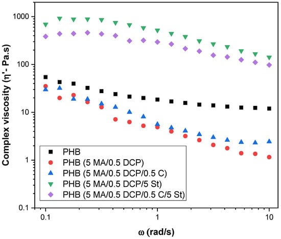 Figure 2 shows the complex viscosity (ƞ’) as a function of the angular frequency (ω) of pure PHB and PHB-g-MA. The analysis was carried out in the linear viscoelastic regime, bearing in mind that the data obtained in this regime are sensitive to small differences or changes in structure [,]. Given this, the modification in the molecular structure of PHB with maleic anhydride, dicumyl peroxide, styrene, and Sn(Oct)2 will be better understood. It was observed that pure PHB had a higher complex viscosity compared with PHB-g-MA (5 MA/0.5 DCP) and PHB-g-MA (5 MA/0.5 DCP/0.5 C) systems. As complex viscosity is directly related to molecular weight [], chain scission was predominant in PHB-g-MA (5 MA/0.5 DCP) and PHB-g-MA (5 MA/0.5 DCP/0.5 C) samples due to the decrease in viscosity. In comparative terms, the PHB-g-MA (5 MA/0.5 DCP/0.5 C) system showed a slight increase in viscosity compared with the PHB-g-MA (5 MA/0.5 DCP) system. This behavior can be attributed to higher maleic anhydride grafting in the PHB-g-MA (5 MA/0.5 DCP/0.5 C) sample, as observed by FTIR. On the other hand, the greater fluidity of the PHB-g-MA (5 MA/0.5 DCP) sample suggests an excess of dicumyl peroxide in the reaction medium. In this case, it caused a higher chain scission and more severe viscosity reduction.