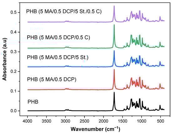 The FTIR technique is an analysis of great interest in evaluating the chemical modification of polymers, as demonstrated in the literature [,]. In Figure 4, the prominent PHB absorption bands are observed before and after chemical modification with styrene (St.), maleic anhydride (MA), DCP, and Sn(Oct)2. The bands at 2975 cm−1, 2932 cm−1, and 2834 cm−1 are related to the asymmetrical stretch of the methyl group (CH3), the anti-symmetrical stretch of the methylene group (CH2), and the symmetrical stretch of the methyl group (CH3) [], respectively. The literature [] indicated that the 2975 cm−1 band in PHB is attributed to the asymmetrical stretch mode of the CH3 group of the crystalline parts. A high absorption band at 1720 cm−1 corresponds to carbonyl (C=O), a value similar to that verified by Cuellar et al. []. The bands at 1453 cm−1 and 1380 cm−1 are characteristic of the asymmetrical in-plane bending vibration of the C-H bond of the CH2 group, and symmetrical in-plane bending vibration of the methyl group (CH3) [], respectively. In addition, the absorption bands found in the region of 1000–1300 cm−1 correspond to the stretch vibrations of the C-O-C group: 1273 cm−1 (C-O-C stretch of the crystalline fraction), 1260 cm−1 (C-O-C stretch and deformation of the CH group of the crystalline fraction), 1224 cm−1 (C-O-C stretch of the amorphous fraction), 1180 cm−1 and 1100 cm−1 (C-O-C stretch), 1053 cm−1 (C-O group stretch) and 1043 cm−1 (C-CH3 stretch). Bands at 977 cm−1, 938 cm−1, 895 cm−1, and 825 cm−1 attributed to the C–C stretch were observed, suggesting the helical structure of the PHB chain []. Therefore, the bands observed in the FTIR spectrum correspond to the chemical bonds of the groups present in the PHB.