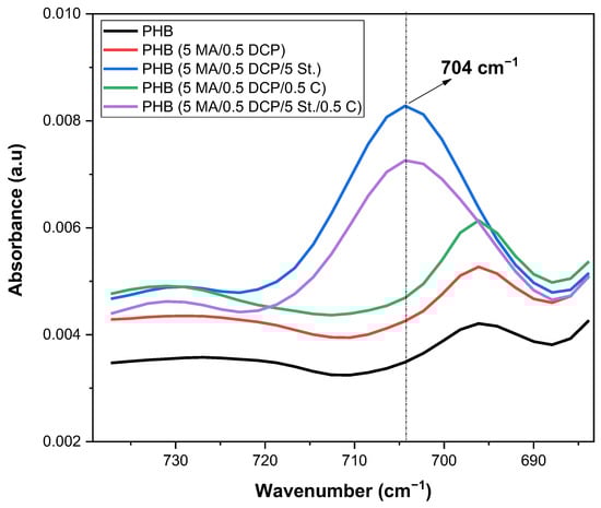 Figure 6 shows the magnification region in the 600–750 cm−1 range of the FTIR spectrum, aiming to understand the behavior of the styrene monomer (St.) in the PHB chain. The PHB (5 MA/0.5 DCP/5 St.) and PHB (5 MA/0.5 DCP/5 St./0.5 C) systems presented a new band at 704 cm−1, corresponding to the out-of-plane bending vibration of the aromatic nucleus of the styrene monomer []. The presence of the 704 cm−1 band suggests that styrene was grafting onto the PHB chain, generating a multiphase component with maleic anhydride (PHB-g-(St-co-MA)). The band intensity at 704 cm−1 characteristic of styrene was observed to be more significant for the PHB (5 MA/0.5 DCP/5 St.) system, which means more considerable styrene grafting. This finding corroborates the trend towards higher viscosity of the PHB (5 MA/0.5 DCP/5 St.) system, as verified in torque rheometry and complex viscosity. In addition, incorporating the Sn(Oct)2 catalyst did not improve the grafting degree of styrene in the PHB (5 MA/0.5 DCP/5 St./0.5 C) system. This reinforces the hypothesis of the previous discussion about the competitive effect between styrene and Sn(Oct)2, as well as a smaller amount of reactive points to react between the molecules.