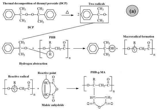 PHB has also been explored in the process of chemical modification with maleic anhydride, with a view of technological applications. In work [], 0.54% was reached as the maximum degree of maleic anhydride grafting in the PHB chain, suggesting a low efficiency in the chemical modification process under cobalt-60 radiation. Hong et al. [] functionalized PHB with maleic anhydride (MA) and benzoyl peroxide (BPO) using an MA/BPO ratio of 5/1 phr (parts per hundred of resin). The authors verified that the PHB grafted in solution has an MA engraftment rate of around 0.07%, while the PHB grafted by fusion is about 1.54%. Furthermore, the 0.7% MA graft significantly improved the PHB thermal stability and crystallization. Chen et al. [] synthesized PHB grafted with maleic anhydride (MA) by polymerization, using benzoyl peroxide (BPO) as an initiator. MA and BPO concentrations played an essential role in the chemical modification of PHB since the degree of engraftment could be controlled in the range of 0.2 to 0.85%. The authors verified a maximum grafting peak of 0.85% when the concentration of MA was 3% and 0.2% of BPO at a temperature of 130 °C. In addition, the thermal stability of PHB-g-MA has been improved by about 20 °C compared with pure PHB.