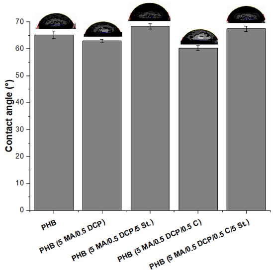 Different behavior in the contact angle was verified for the PHB (5 MA/0.5 DCP/5 St.) and PHB (5 MA/0.5 DCP/5 St./0.5 C) systems since they increased to 68.3° and 67.4°, respectively. The incorporation of a styrene monomer made PHB-g-MA more hydrophobic, surpassing the pure PHB contact angle. As the styrene graft in the PHB chain increased, as seen in Figure 6, there was a greater tendency for the contact angle to increase. The styrene monomer is non-polar, forming a barrier effect on the surface of PHB (5 MA/0.5 DCP/5 St.) and PHB (5 MA/0.5 DCP/5 St./0.5 C) samples, minimizing interaction with water and increasing the contact angle. Given this, the PHB-g-(St-co-MA) system is less sensitive to the effect of humidity during thermomechanical processing, generating greater stability against degradation.