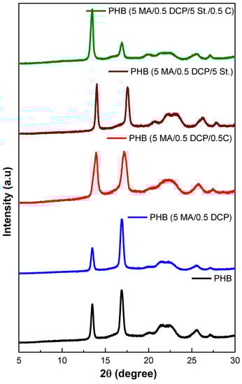 Figure 9 shows the curves obtained by XRD of PHB and PHB-g-MA as a function of incorporation with styrene (St.), maleic anhydride (MA), DCP, and Sn(Oct)2. Data on the degree of crystallinity are summarized in Table 2. The PHB diffractogram illustrates the presence of well-defined crystalline peaks and, at the same time, an amorphous halo, typical of the behavior of semi-crystalline polymers. Two peaks of high intensity were observed around 2θ = 13.49° and 2θ = 16.9°, attributed to planes (020) and (110) [], respectively. The low-intensity crystalline peaks at 2θ = 19.8°, 2θ = 21.6°, 2θ = 22.1°, 2θ = 25.6°, and 2θ = 27° are from (021), (101), (111), (121), and (040) [], respectively. The results indicate a crystalline structure with an orthorhombic unit cell, with the parameters a = 5.76 , b = 13.2 e, and c = 5.96 []. The peaks at 2θ = 13.49°, 2θ = 21.6°, and 2θ = 22.1° suggest that PHB forms a structure with a predominance of α crystals, as reported in []. However, the small peak with low intensity was around 2θ = 19.8° indicates the nucleation of crystals in the β form []. This indicates a hybrid population of crystals, α and β, with a predominance of the α form. The literature [] reported that PHB’s most common crystal structure is in the α-form since it is developed under typical melting conditions.