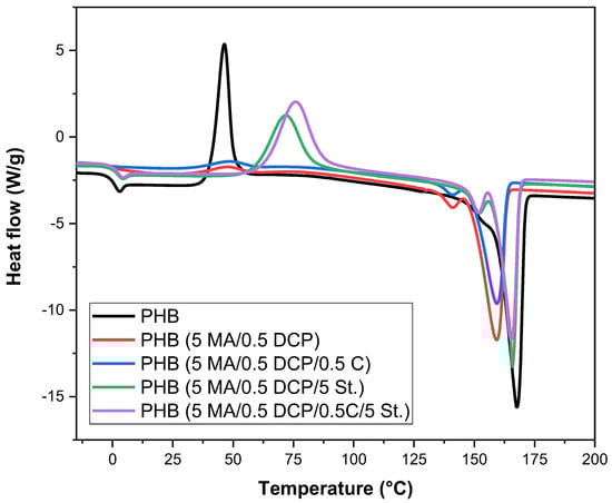 In Figure 10, an exothermic peak was observed in the 40–80 °C range due to the cold crystallization process. This phenomenon is attributed to the rearrangement of amorphous regions in a crystalline phase, as reported in the literature []. Pure PHB showed a cold crystallization temperature (Tcc) of 46.3 °C. The PHB-g-MA (5 MA/0.5 DCP) and PHB-g-MA (5 MA/0.5 DCP/0.5 C) systems maintained the Tcc peak, similar to pure PHB. However, a significant reduction in the intensity of the Tcc peak was observed, specifically for PHB-g-MA (5 MA/0.5 DCP) and PHB-g-MA (5 MA/0.5 DCP/0.5 C). This indicates that maleic anhydride or dicumyl peroxide additives inhibited the cold crystallization of PHB. On the other hand, the PHB-g-MA (5 MA/0.5 DCP/5 St.) and PHB-g-MA (5 MA/0.5 DCP/0.5 C/5 St.) samples showed a very evident Tcc shift, with values of 75.8 °C and 71.8 °C, respectively. The PHB-g-MA (5 MA/0.5 DCP/5 St.) and PHB-g-MA (5 MA/0.5 DCP/0.5 C/5 St.) systems had accelerated nucleation at Tcc. Incorporating a styrene monomer was important to accelerate the cold crystallization process, acting as a nucleating agent for this phenomenon in the PHB matrix.