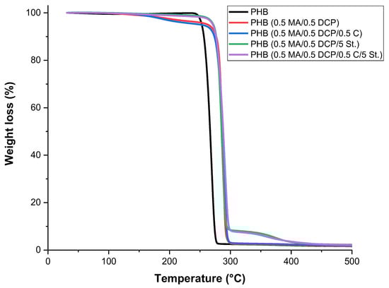 Figure 11 illustrates the behavior of the thermal stability of pure PHB and PHB-g-MA as a function of the additives. It was observed that pure PHB suffered severe thermal degradation above 250 °C, with the material being wholly decomposed in a single step up to 300 °C without generating waste. The literature [,] indicates that the thermal degradation mechanism of PHB is based on the random scission of ester groups, generating the elimination of a β hydrogen. The PHB (5 MA/0.5 DCP) and PHB (5 MA/0.5 DCP/0.5 C) samples showed a slight decrease in the TG curve in the 170–260 °C range, referring to the loss of maleic anhydride. By adding styrene monomer, the PHB (5 MA/0.5 DCP/5 St) and PHB (5 MA/0.5 DCP/5 St./0.5 C) systems maintained thermal stability at a constant level; that is, there was no decrease in the curve at a temperature below 300 °C. This suggests that styrene promoted a barrier effect protecting the maleic anhydride functional group, generating greater resistance to thermal decomposition. The most important finding was that the thermal decomposition temperature of the PHB chain increased after MA grafting for all samples. The expansion of the thermal stability of PHB after the maleic anhydride graft is of great importance for the industrial sector, considering the processing in extruder and injection.