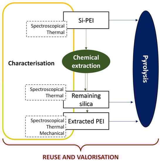 The manuscript is structured as follows (see Figure 1). Firstly, the starting materials are described along with their macroscopical properties. Next, a method for the chemical extraction of PEIs from Si-PEI samples is proposed and the characterizations of the extracted PEIs and remaining silica matrix are presented. Lastly, the valorization of the spent materials by pyrolysis is discussed, encompassing both the formation of valuable compounds and the impact of the chemical extraction on the regeneration of silica support. Concomitantly, the characterization of the sorbed and extracted PEIs was investigated with the aim of enhancing the current understanding of its degradation.