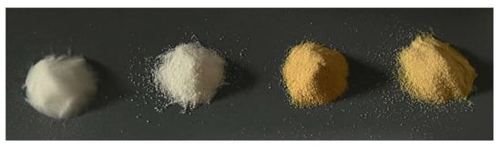 Macroscopically, as shown in Figure 2, one of them is white (SP0) and two are yellow-orange colored Si-PEI powders (SP2 and SP3) containing some visible black residues. Focusing on the particle size, it is clearly visible to the naked eye that pure silica consists of smaller grains than the other ones.