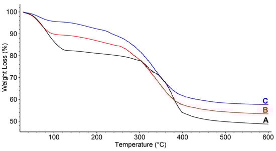 TGA thermograms of SP0 (A, black), SP2 (B, red), and SP3 (C, blue) in a nitrogen atmosphere.