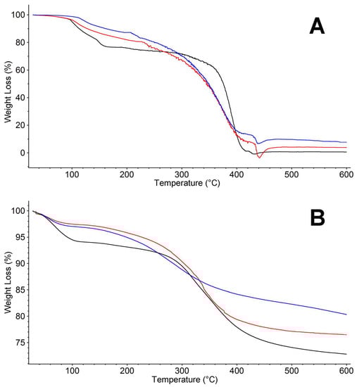 TGA. The samples’ thermal stability was evaluated via TGA analysis using a thermogravimetric apparatus (TA Instruments Q600, New Castle, DE, USA), under a nitrogen and/or air atmosphere condition (flow rate 20 mL/min), by heating the sample (10 mg) at a 10 °C/min heating rate, from 25 °C to 600 °C or 850 °C.