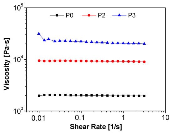 Figure 6 highlights an increase in viscosity moving from sample P0 to P2 and P3, in relation with the presence and quantity of adsorbed CO2. This behavior was reported for different systems, such as amine solutions [48,49], ionic liquids [50,51], and PEI/PEG blends [52] where the increase in viscosity is due to the formation of carbamate ion pairs, which leads to cross-linking between the polymer chains.