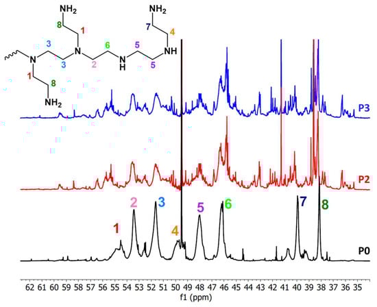 The chemical shifts of the aliphatic region are characterized by the presence of alkyl groups of PEIs adjacent to the primary amines (38–40 ppm), secondary amines (45–53 ppm) and tertiary amines (53–57 ppm) [54,55,56] (Figure 7).