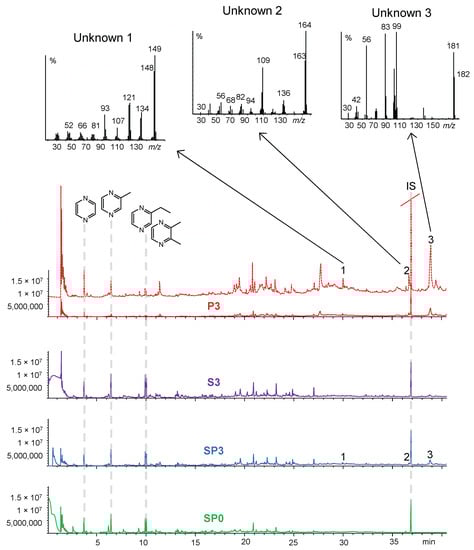 MS-pyrograms from Py-GC-MS at 600 °C of (from bottom to top) SP0 (green), SP3 (light blue), S3 (purple), P (red). The magnified pyrogram of P3 is also shown (red dotted line) with the mass spectra of GC peaks #1, #2, and #3, indicative of degradation. IS stands for internal standard.
