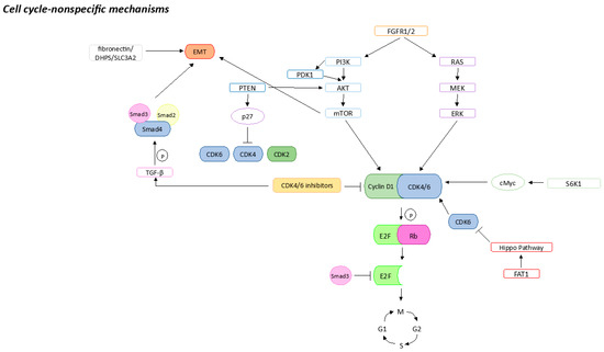 Cell-cycle-non-specific mechanisms include the overexpression of factors that are upstream of the cell cycle, such as FGFR and PI3K/AKT/mTOR, resulting in decreased efficacy of CDK4/6is (Figure 2).