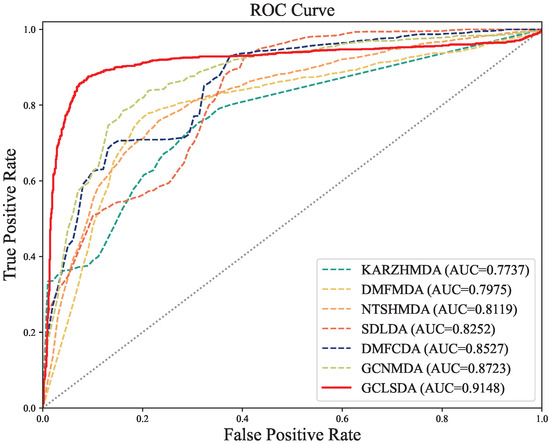 In this comparative analysis, we juxtaposed our GCLSDA model against six closely related methods: KATZHMDA [20], DMFMDA [21], NTSHMDA [22], SDLDA [23], DMFCDA [24], and GCNMDA [25]. KATZHMDA operates on the KATZ algorithm for predicting microbe–disease associations, whereas DMFMDA leverages neural networks to predict these associations after mapping one-hot encoded microbe and disease IDs to low-dimensional vectors. SDLDA combines the SVD algorithm with a deep neural network for lncRNA–disease association prediction, while DMFCDA employs deep neural networks to derive nonlinear features from circRNA–disease association matrices. GCNMDA leverages graph neural networks and conditional random fields for drug-disease association inference, while NTSHMDA employs a random walk with a restart-based approach to predict microbe–disease associations.