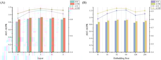 Effects of depth K and embedding size S on the performance of GCLSDA. (A) The effect of layer depth K. (B) The effect of embedding size S.