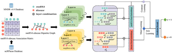 When addressing the prediction of snoRNA–disease associations, the prevailing supervised learning signals continue to grapple with issues of data sparsity, impeding the acquisition of refined representations. To mitigate this, we embraced self-supervised contrastive learning [35,36] as our preferred training approach. Contrastive learning stands as an alternative methodology that circumvents the limitations encountered in conventional self-supervised learning paradigms. By doing so, it furnishes a comprehensive framework to enhance both the efficacy and robustness of the model concerning the prediction task.