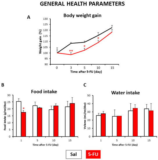 Figure 1. Effect of the antitumoral drug 5-fluoruracil on general health parameters in the rat. Body weight gain (A) and food (B) and water intake (C) were evaluated in control animals treated with saline (Sal, black line or white bars) or 5-fluoruacil (5-FU, 150 mg/kg, ip; red line or bars). Data represent mean ± SEM. N = 8 each group (two-way ANOVA followed by Bonferroni’s post-hoc test). * p < 0.05, ** p < 0.01 vs. saline.