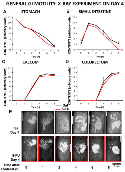 Figure 2. Effect of the antitumoral drug 5-fluororuacil on gastrointestinal motor function in the rat. Motor function was evaluated using radiological methods (see text) in rats treated with saline (Sal, black line) or 5-fluorouracil (5-FU, 150 mg/kg, ip; red line) on day 4 after 5-FU. At that time point, barium sulfate (2.5 mL, 2 g/mL) was gavaged, and radiographs were taken 0–8 h after contrast administration. Data represent mean ± SEM for motor function in stomach (A), small intestine (B), cecum (C), and colorectum (D). N = 8 each group (two-way ANOVA followed by Bonferroni post-hoc test). (E) Representative radiographic images obtained for the different treatment groups. Scale bar: 3 cm.