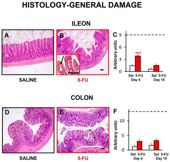 Figure 3. General study of the histological damage of small and large intestine after 5-FU administration in the rat. Ileum (A,B) and colon (D,E) micrographs showing organ architecture in animals treated with saline (Sal; (A,D)) or 5-fluorouracil (5-FU, 150 mg/kg, ip; (B,E)); these images correspond to samples obtained on day 4 after treatment. Insert in (B) shows enlarged lymph vessels (arrow). Bar: 100 µm. Quantitative analyses of the histological damage are shown for ileum (C) and colon (F). Bars represent mean values ± SEM for Sal-treated (control, white) and FU-treated animals (red), 4 or 15 days after 5-FU administration. Dotted lines indicate the maximum damage score that could be reached in the ileum (C) and colon (F). N = 4–7 each group. *** p < 0.001 vs. saline (two-way ANOVA followed by Bonferroni’s post-hoc test).