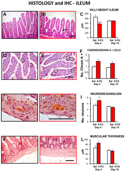 Figure 4. Specific histological and immunohistochemical study of the effect of 5-FU on the rat ileum. Micrographs showing the structural ileum features in saline-treated animals (Sal; (A,D,G,J)) or 5-fluorouracil (5-FU, 150 mg/kg, ip; (B,E,H,K)), 4 days after treatment. Ileal villi (A,B) with enlarged lymph vessels (arrow in (B)), chromogranin A+ cells in mucosa (encircled in (D,E)), neurons in the myenteric ganglia (G,H), and muscle layers (J,K). Bars: 100 µm. Quantitative analyses of the histological samples (C,F,I,L). Bars represent mean values ± SEM for Sal-treated (control, white) and 5-FU-treated animals (red), 4 or 15 days after 5-FU administration. N = 4–7 each group. * p < 0.05, *** p < 0.001 vs. saline (two-way ANOVA followed by Bonferroni’s post-hoc test).