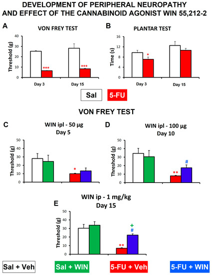 Figure 5. Development of peripheral neuropathy induced by the antitumoral drug 5-fluorouracil and effect of the cannabinoid agonist WIN55,212-2 locally or systemically administered in the rat. Saline (Sal, white bars) or 5-fluorouracil (5-FU, 150 mg/kg, ip; red bars) were administered and the thresholds for mechanical sensitivity (A) and thermal sensitivity (B) were evaluated with the von Frey test and the plantar test, respectively. The cannabinoid agonist WIN 55,212-2 (WIN) or its vehicle (Veh) was locally (intraplantarly, ipl: 50 µg (C); 100 µg (D)) or systemically (intraperitoneally, ip: WIN 1 mg/kg, (E)) administered at different time-points after 5-FU (5, 10 and 15 days, respectively), and the effect was thereafter evaluated using the von Frey hair test. Bars represent mean ± SEM. N = 8 each group. * p < 0.05, ** p < 0.01, *** p < 0.001 vs. control (Sal or Sal+Veh); # p < 0.05 vs. 5-FU+Veh; + p < 0.05 vs. Sal+WIN (one or two-way ANOVA followed by Bonferroni’s post-hoc test).